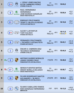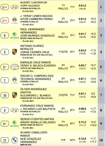 Con estos tiempos Cruz – Luis mantienen su quinta plaza, pero a 1.3 de Cabrera – Hernández, sextos. Pero tampoco se pueden relajar porque vienen fuertes Suárez – Cedrés, que son séptimos a 5.2, logrando arrebatarles el puesto Sergio Fuentes y Ariday Bonilla (Skoda Fabia RS Rally2), que bajan a la octava plaza.