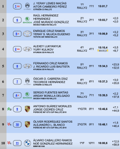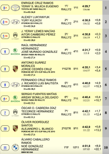 Óscar Cabrera – Teco Hernández (Citroën C3 Rally2), a 4.5, seguidos de Oliver Rodríguez – Alejandro Blanco (Porsche 911 GT3 Cup Rallye 2010), a 5.8 y de