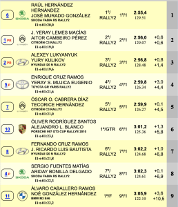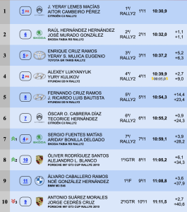 En la general Cruz – Ricardo Luis son son quintos, superando en sólo 0.9 a Cabrera – Hernández, sextos, ascendiendo a la séptima plaza Sergio Fuentes y Ariday Bonilla (Skoda Fabia RS Rally2), mientras que Rodríguez – Blanco mejoran dos puestos para situarse octavos.