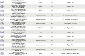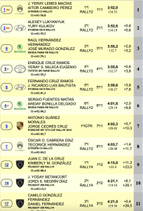 El abandono de Oliver Rodríguez – Alejandro Blanco (Porsche 911 GT3 Cup Rallye 2010) propicia que Sergio Fuentes y Ariday Bonilla (Skoda Fabia RS Rally2) asciendan a la octava plaza, ocupando las tres siguientes posiciones los tres primeros clasificados de la Rally4 Cup, Juan Carlos de la Cruz – Kimberly González (Peugeot 208 Rally4), José Yoday Betancort – Jordi Samuel Negrín (Peugeot 208 Rally4) y Camilo González – Daniel Fernández (Peugeot 208 Rally4).