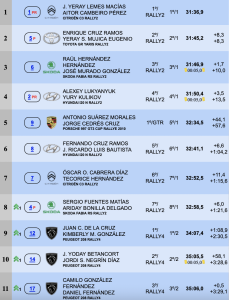 Quintos son Toñín Suárez – Jorge Cedrés (Porsche 911 GT3 Cup Rallye 2010), a 6.6 de Fernando Cruz – José Ricardo Luis (Hyundai i20 N Rally2), sextos, que superan en 11.4 a Óscar Cabrera – Teco Hernández (Citroën C3 Rally2), séptimos.
