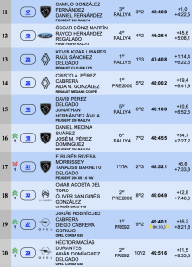 Los tinerfeños Óscar Dóniz – Rayco Hernández (Ford Fiesta Rally4) acabaron décimo segundos, seguidos de sus paisanos Kevin Kipar – Raúl Sánchez (Renault Clio Rally5), décimo terceros.