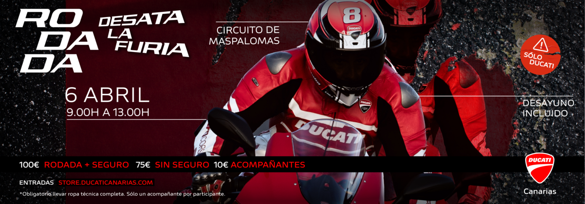 Ducati Canarias vuelve a encender el asfalto con una jornada exclusiva para los amantes de la velocidad y la emoción. El próximo domingo 6 de abril, de 9:00 a 13:00 horas, el Circuito de Maspalomas se convertirá en el escenario perfecto para vivir una experiencia 100% Ducati. Una oportunidad única para exprimir el potencial de tu bestia en un entorno seguro y diseñado para disfrutar al máximo.