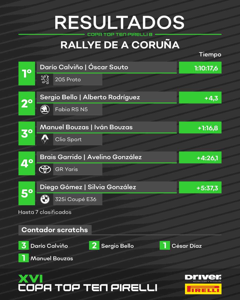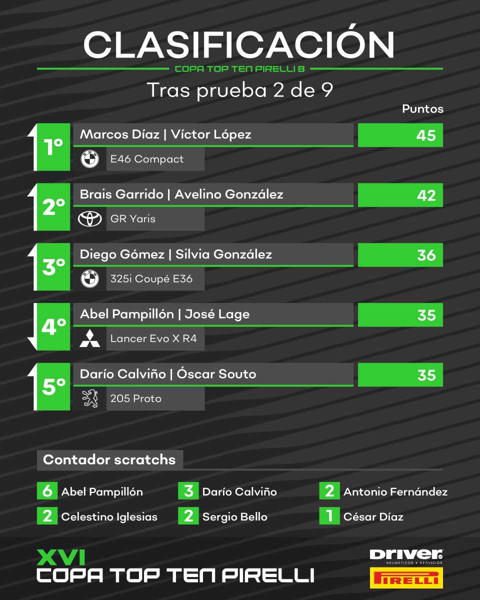 En la Copa Top Ten Pirelli «B», Sergio Bello se destacó desde un inicio, imponiendo la tracción total de su Skoda Fabia RS N5, y aunque tuvo que vérselas con un espectacular César Díaz, que a bordo de su Peugeot 205 tomaba el liderato tras la segunda especial, el lucense sufría una aparatosa salida de carretera en la tercera, sin consecuencias personales.