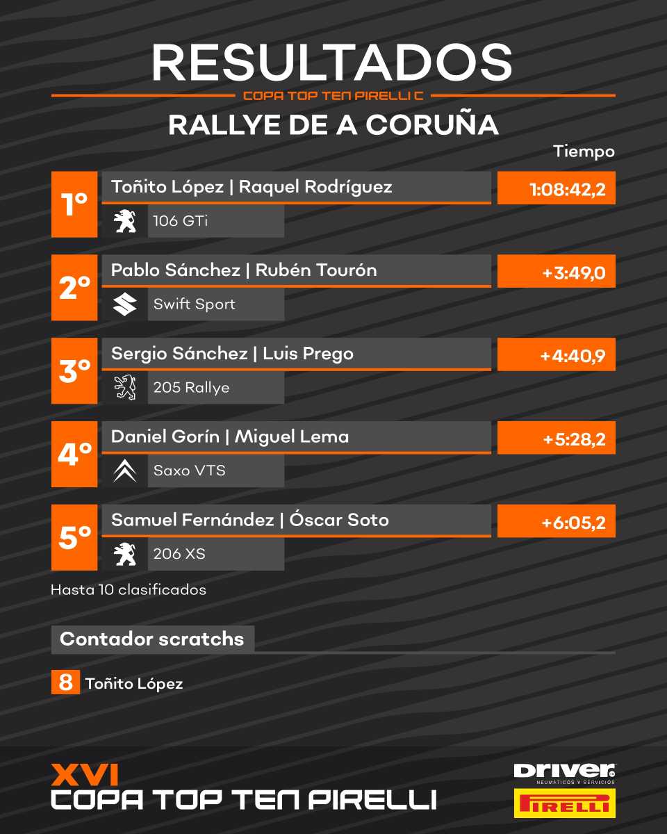 En cuanto a la Copa Top Ten Pirelli «C», el principal favorito, Toñito López, cumplió las expectativas sobre un terreno que se le da muy bien, y aunque tuvo cierta competencia por parte de Dani Castro y David Rivas durante los primeros compases, ambos quedaban apeados de la lucha en la segunda especial, dejando a López con más de un minuto de ventaja sobre el resto de competidores.
