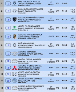 Julián Falcón-Daniel Rosario (Skoda Fabia R5) marcaban el cuarto mejor crono, a 22.8, seguidos de Alberto Monzón-Aday Suárez (Porsche 997 GTR 2007), quintos a 28.3, mismo tiempo que los sextos clasificados, Noé Armás-Efraín González (Renault Clio Rally4).