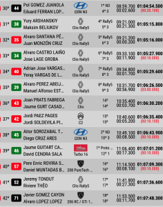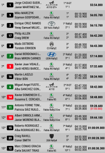 El gallego manda en la clasificación con 10.9 segundos de ventaja respecto a Miko Marczyk / Szymon Gospodarczyk, que no ha sido capaz de mantener el ritmo de los del Alpine Recalvi Team. La tercera posición absoluta, segunda del Campeonato de España de Rallyes de Asfalto – Recalvi al no bloquear puntos el polaco, sigue siendo para Enrique Cruz / Yeray Mujica con el Toyota GR Yaris Rally2 de Llarena Racing a 20.9 segundos.