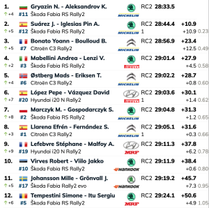 Segundos son los asturianos José Antonio Suárez y Alberto Iglesias (Škoda Fabia RS Rally2), que están a 10.9, siendo terceros los galos Yoann Bonato y Benjamin Boulloud (Citroën C3 Rally2), que están a 23.4 del liderato y a 12.5 del segundo puesto.