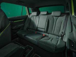 El habitáculo del Škoda Elroq RS refleja su carácter dinámico con el interior Design Selection RS Lounge, donde predomina el color negro con detalles en verde lima. La tapicería está fabricada en microfibra Suedia con costuras en contraste en verde lima, mientras que los acabados decorativos presentan un aspecto de fibra de carbono. El volante deportivo calefactado de tres radios, forrado en cuero perforado, incluye costuras en verde lima y el distintivo RS en su base.