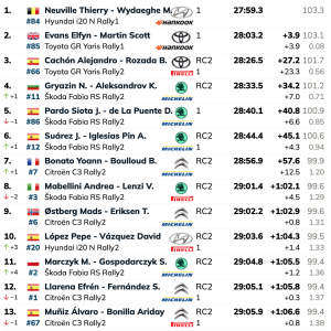 Los asturianos José Antonio Suárez y Alberto Iglesias (Škoda Fabia RS Rally2) son sextos, a sólo 4,3 de sus compañeros en Skoda, seguidos de los galos Yoann Bonato y Benjamin Boulloud (Citroën C3 Rally2) y de los italianos Andrea Mabellini y Virginia Lenzi (Škoda Fabia RS Rally2), que perdieron dos puestos en el último tramo del bucle.