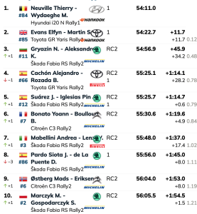 Los noruegos Mads Østberg y Torstein Eriksen (Citroën C3 Rally2) son novenos, seguidos de los polacos Mikołaj Marczyk y Szymon Gospodarczyk (Škoda Fabia RS Rally2), que cierran el top 10, puesto que pierden los españoles Pepe López y David Vázquez (Hyundai i20 N Rally2) por sólo 0.5.