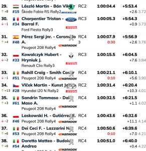 Séptimos son los italianos Andrea Mabellini y Virginia Lenzi (Škoda Fabia RS Rally2), seguidos de Javier Pardo y David de La Puente (Škoda Fabia RS Rally2), que son octavos y bajan después de haber rodado en la quinta plaza.