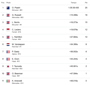 El australiano de McLaren logró con este triunfo 74 puntos en el Campeonato de Pilotos, sólo tres menos que su compañero Lando Norris, que quedó en tercer lugar en la carrera compuesta por 57 vueltas en un circuito de 5.412 kilómetros de longitud. El inglés tuvo una sanción de cinco segundos, lo que le impidió ser segundo.