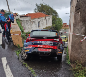 El golpe fue fuerte, contra las casas que estaban en los lados de la carretera, quedando dañado el Hyundai i20 N Rally2, que perdía una rueda, un amortiguador, el alerón… Un alerón que alguien decidió robarlo y llevárselo como recuerdo, porque de poco más le servirá, pero el daño que le hace al equipo oficial de Hyundai Canarias es importante, no sólo por su alto coste, miles de euros, sino por lo complicado que está hoy en día poder tener este tipo de piezas de manera rápida.