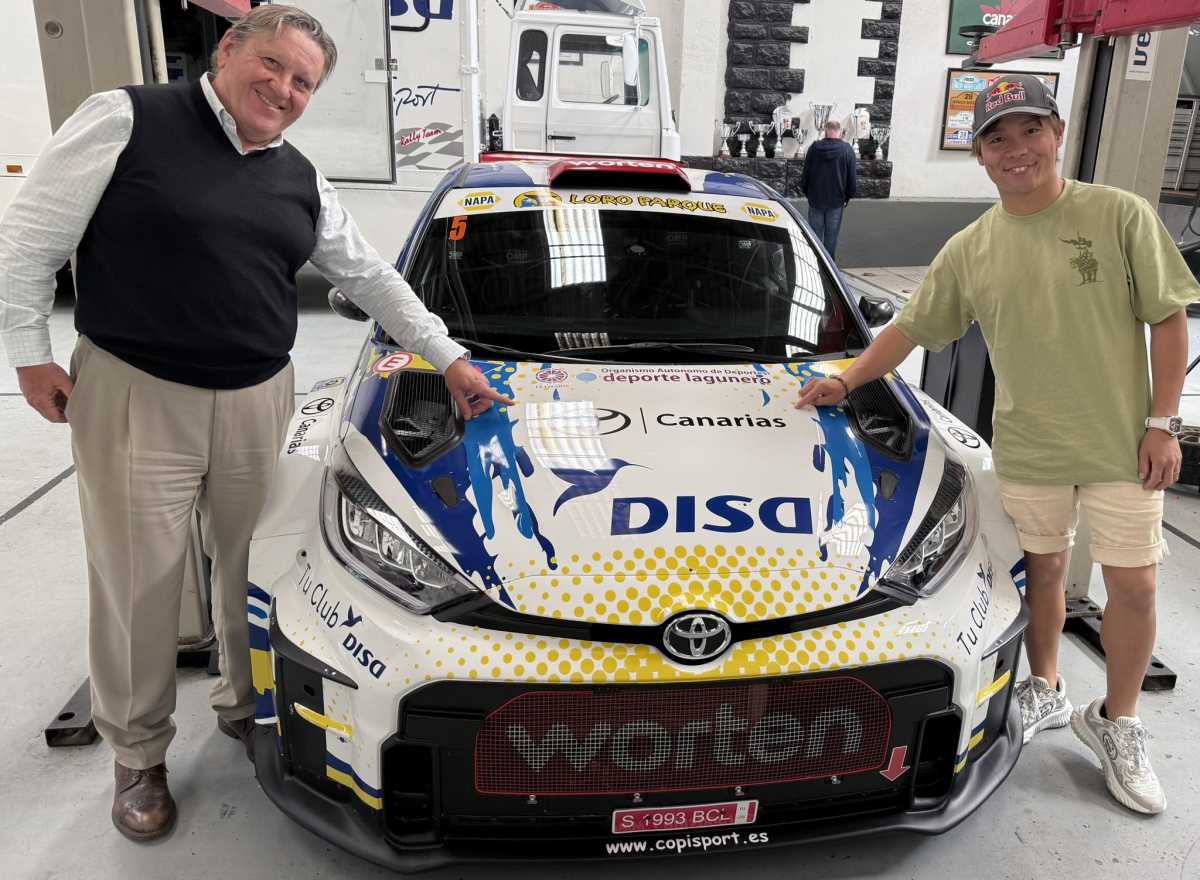 El piloto japonés Takamoto Katsuta ha estado de visita en la isla de Tenerife y aprovechó para acercarse a las instalaciones del equipo tinerfeño Copi Sport, posando junto al jefe de equipo, Fernando Capdevila, con el Toyota GR Yaris Rally2 con el que compiten el tinerfeño Enrique Cruz y el grancanario Yeray Mujica en el Campeonato de Canarias de Rallys de Asfalto 2025.