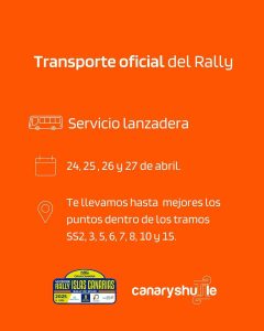 Canaryshuttle es el transporte oficial y exclusivo del WRC Rally Islas Canarias 2025 durante los días 24, 25 , 26 y 27 de abril
