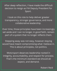 Robert Reid, ex copiloto campeón del mundial de rallys con Richard Burns, dimitía días atrás como vicepresidente deportivo de la Federación Internacional del Automóvil (FIA), explicando en sus redes los motivos.