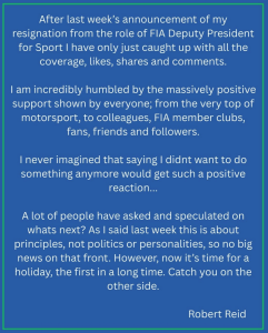 «Tras el anuncio de mi renuncia al cargo de Vicepresidente de Deportes de la FIA la semana pasada, acabo de ponerme al día con toda la cobertura, los «me gusta», las publicaciones compartidas y los comentarios. Me siento increíblemente honrado por el apoyo tan positivo que me ha mostrado todo el mundo: desde las altas esferas del automovilismo hasta colegas, clubes miembros de la FIA, aficionados, amigos y seguidores», agradeció.