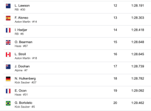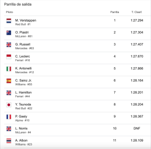 El tercer lugar de la parrilla fue para George Russell, de Mercedes, siendo cuarto el primer Ferrari, el de Charles Leclerc. El joven Andrea Kimi Antonelli estará en la tercera fila en la quinta plaza, junto al español Carlos Sainz, que ha tenido un gran sábado en el Williams. En la cuarta fila estará Lewis Hamilton, de Ferrari y Yuki Tsunoda, de Red Bull,