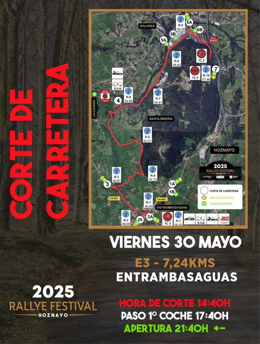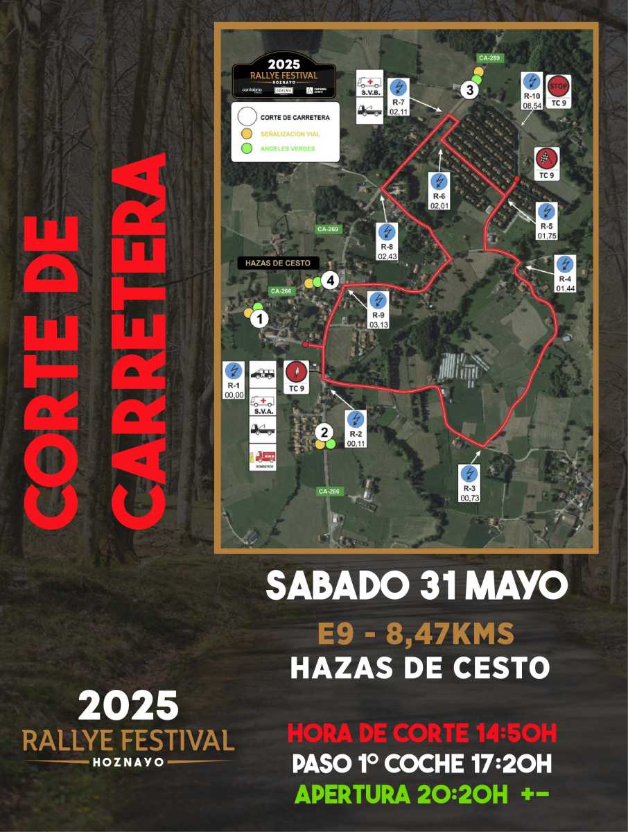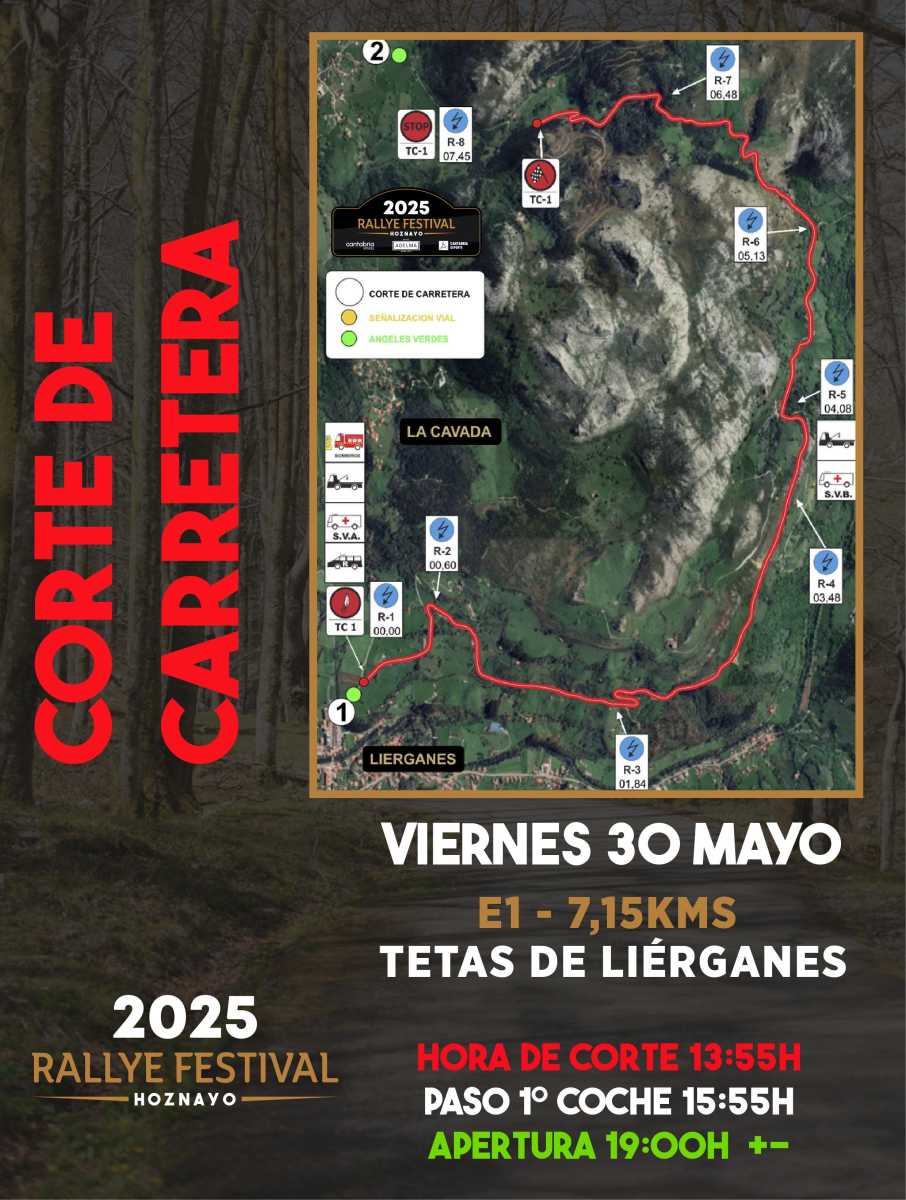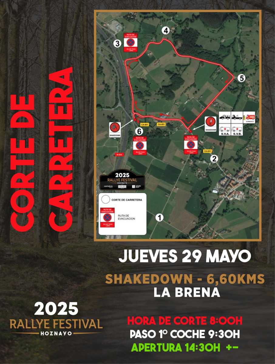 Publicamos los horarios de los cortes de carretera de esta edición del Rallye Festival Hoznayo 2025.