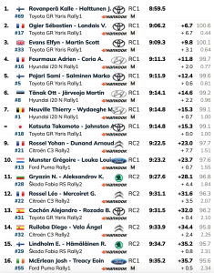 Takamoto Katsuta y Aaron Johnston (Toyota GR Yaris Rally1) también pierden un puesto, pero están a sólo 1.1 de Tanak, mientras que Thierry Neuville-Martijn Wydaeghe (Hyundai i20N Rally1) son octavos a sólo 2.2 de los anteriores. De la cuarta a la octava plaza sólo hay cuatro segundos de diferencia.