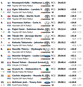 El francés Adrien Fourmaux y Alexandre Coria (Hyundai i20N Rally1) son el primer Hyundai clasificado como cuarto mejor crono en el tramo y cuarto en la general, seguidos de Sami Pajari y Marko Salminen (Toyota GR Yaris Rally1), que ascienden al quinto lugar de la general a sólo 5.3 de los anteriores y superando en 1.7 a Ott Tanäk-Martin Järveoja (Hyundai i20N Rally1), que bajan un puesto.