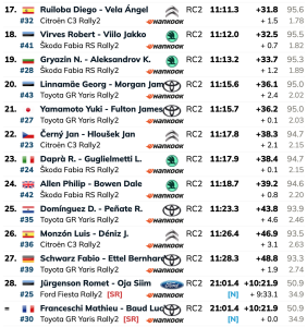 Ascienden a la undécima plaza los españoles Alejandro Cachón y Borja Rozada (Toyota GR Yaris Rally2), que están a 15.8 del liderato del WRC, seguidos a 1.2 de los irlandeses Josh McErlean y Eoin Treacy (Ford Puma Rally1), oficiales de M-Sport,ascendiendo también un puesto los franceses Léo Rossel y Guillaume Mercoiret (Citroën C3 Rally2), tercer Rally2. Los tres equipos mencionados mejoran una plaza por la tres que han perdido en esta especial los rusos Nikolay Gryazin y Konstantin Aleksandrov (Škoda Fabia RS Rally2), que caen a la décimo cuarta posición.
