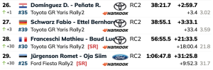 Novenos continúa el equipo oficial de M-Sport, Grégoire Munster y Louis Louka (Ford Puma Rally1),, seguidos de los líderes del WRC2, galos Yohan Rossel y Arnaud Dunand (Citroën C3 Rally2), que cierran el top 10.