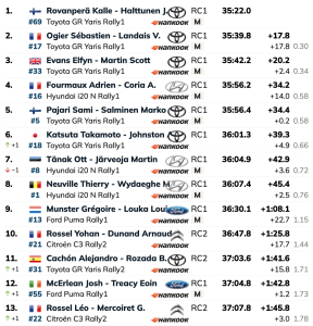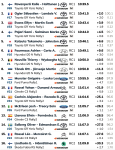 Lejos de los tres anteriores se siguen los francés Adrien Fourmaux y Alexandre Coria (Hyundai i20N Rally1), primeros entre los Hyundai, pero con Sami Pajari y Marko Salminen (Toyota GR Yaris Rally1) a sólo 0,2 tras un gran cuarto mejor crono en la especial.