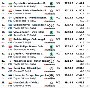 Ascienden a la undécima plaza los españoles Alejandro Cachón y Borja Rozada (Toyota GR Yaris Rally2), que están a 15.8 del liderato del WRC, seguidos a 1.2 de los irlandeses Josh McErlean y Eoin Treacy (Ford Puma Rally1), oficiales de M-Sport,ascendiendo también un puesto los franceses Léo Rossel y Guillaume Mercoiret (Citroën C3 Rally2), tercer Rally2. Los tres equipos mencionados mejoran una plaza por la tres que han perdido en esta especial los rusos Nikolay Gryazin y Konstantin Aleksandrov (Škoda Fabia RS Rally2), que caen a la décimo cuarta posición.