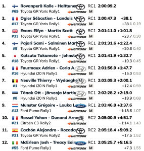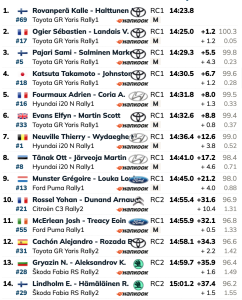 Evans continúa tercero de la general, a 1:01.8 del liderato, a 23.7 del segundo puesto y superando en 20.5 a Pajari, cuarto. Katsuta es quinto a 10.3 de Pajari, superando en 15.0 al primer piloto de Hyundai Motorsport, Fourmaux