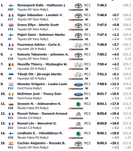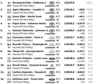 Como ocurrió en el tramo inicial del ‘Moya – Gáldar’ (24,09 km), los galos Sébastien Ogier y Vincent Landais (Toyota GR Yaris Rally1) han estado cerca de poder arrebatarle el mejor tiempo de la especial a su compañeros Kalle Rovanperä y Jonn Halttunen (Toyota GR Yaris Rally1), pero 0.8 evitaron que los líderes perdieran su primer victoria de tramos, por que lo que han vuelto a ser los más rápidos y amplía al ocho de ocho.