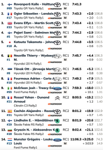 Thierry Neuville-Martijn Wydaeghe (Hyundai i20N Rally1) y Ott Tanäk-Martin Järveoja (Hyundai i20N Rally1) son séptimos y octavos, seguidos ahora por Yohan Rossel y Arnaud Dunand (Citroën C3 Rally2), líderes del WRC2 y novenos de la general debido a los problemas de Grégoire Munster y Louis Louka (Ford Puma Rally1), que han perdido mucho tiempo por culpa de una salida de carretera que les hace ceder siete plazas, cayendo al décimo sexto puesto.