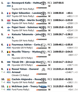 Los rusos Nikolay Gryazin y Konstantin Aleksandrov (Škoda Fabia RS Rally2) son décimo segundis y terceros de la WRC2, seguidos de los galos Léo Rossel y Guillaume Mercoiret (Citroën C3 Rally2), décimo terceros y cuartos del WRC2, los españoles Efrén Llarena . Sara Fernández (Citroën C3 Rally2), décimo cuartos y quintos del WRC2, y Diego Ruiloba – Ángel Vela (Citroën C3 Rally2) décimo quintos y sextos del WRC2.