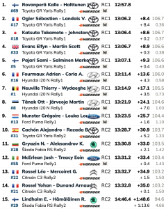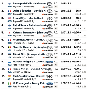 Sextos del tramo y la general son Adrien Fourmaux y Alexandre Coria (Hyundai i20N Rally1), seguidos de sus compañeros de equipo en Hyundai Motorsport Thierry Neuville-Martijn Wydaeghe (Hyundai i20N Rally1) y Ott Tanäk-Martin Järveoja (Hyundai i20N Rally1), séptimos y octavos del tramo y la general. Lejos todos los pilotos del i20N de los Toyota.