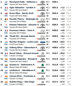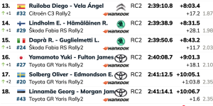 Undécimos y terceros del WRC2, los rusos Nikolay Gryazin y Konstantin Aleksandrov (Škoda Fabia RS Rally2), seguidos de los españoles Efrén Llarena y Sara Fernández (Citroën C3 Rally2), cuartos del WRC2, pero con Grégoire Munster y Louis Louka (Ford Puma Rally1) a cinco segundos después de recortarles 9 en un solo tramo, por lo que será complicado poder mantener este puesto