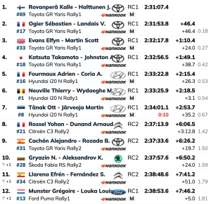A pesar de un duro trabajo en la asistencia durante la noche, Ott Tanäk-Martin Järveoja (Hyundai i20N Rally1) marcó el séptimo mejor registro, a lo que se le añade una penalización de 10 segundos. Es séptimo de la general a más de medio minuto de su compañeros y con más de seis minutos sobre su perseguidor, Yohan Rossel y Arnaud Dunand (Citroën C3 Rally2), líderes del WRC2, que son octavos.