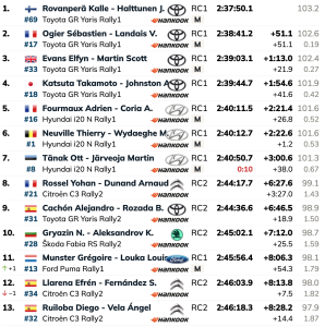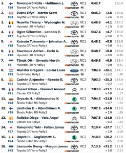Séptimos del tramo y de la general, Ott Tanäk-Martin Järveoja (Hyundai i20N Rally1), en tierra de nadie al estar a más de medio minuto y superando en en casi seis minutos y medio a los líderes del WRC2, los galos Yohan Rossel y Arnaud Dunand (Citroën C3 Rally2), octavos.