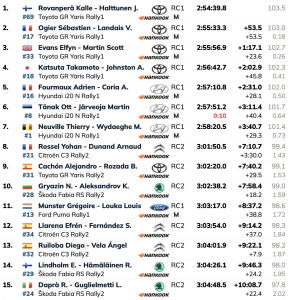 Los ex campeones del mundo, los estonios Ott Tanäk y Martin Järveoja (Hyundai i20N Rally1) no tuvieron su rally, como casi todos los coches del equipo, finalizando sextos, a 3:11.4, mejorando dos puestos por los problemas de otros rivales. Séptimos fueron Neuville y Wydaeghe, que en su lucha por intentar ser quintos arriesgaron, pincharon y perdieron un puesto, finalizando a 3:40.7 del liderato.