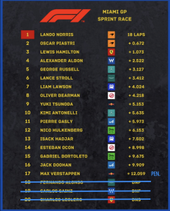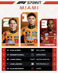 La carrera Sprint del Gran Premio de Miami de Fórmula Uno, que estuvo pasa por el agua, fue a parar a manos del piloto inglés Lando Norris (McLaren), seguido por su compañero de equipo Oscar Piastri, que con este segundo puesto afianza su liderato en el Campeonato de Pilotos.