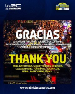 Desde el Comité Organizador del 49 Rally Islas Canarias – Rally de España, queremos expresar nuestro más profundo y sincero agradecimiento a todas las personas, instituciones y entidades que han hecho posible el éxito de esta histórica edición, la primera como prueba puntuable para el Campeonato del Mundo de rallies (WRC).