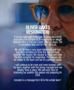 «Oli y yo tenemos una muy buena relación y teníamos ambiciones a largo plazo de impulsar este equipo juntos. Respetamos la solicitud de Olis de dimitir y por tanto hemos aceptado su dimisión. Los motivos no están relacionados con el equipo y son de carácter personal», añade.