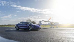 El Taycan tomó la delantera desde la salida. Como la carrera comenzó en un aeródromo, en lugar de en una carretera pública, Hammond pudo liberar todo el potencial de la impresionante aceleración del coche, proporcionada por su par motor de hasta 1.240 Nm con Launch Control. Aceleró de 0 a 100 km/h en solo 2,3 segundos. De hecho, con una potencia máxima del sistema de 1.108 CV cuando se utiliza el Launch Control con Overboost, el Taycan Turbo GT supera incluso al Bugatti Veyron que participó en la carrera mencionada anteriormente de 2005.