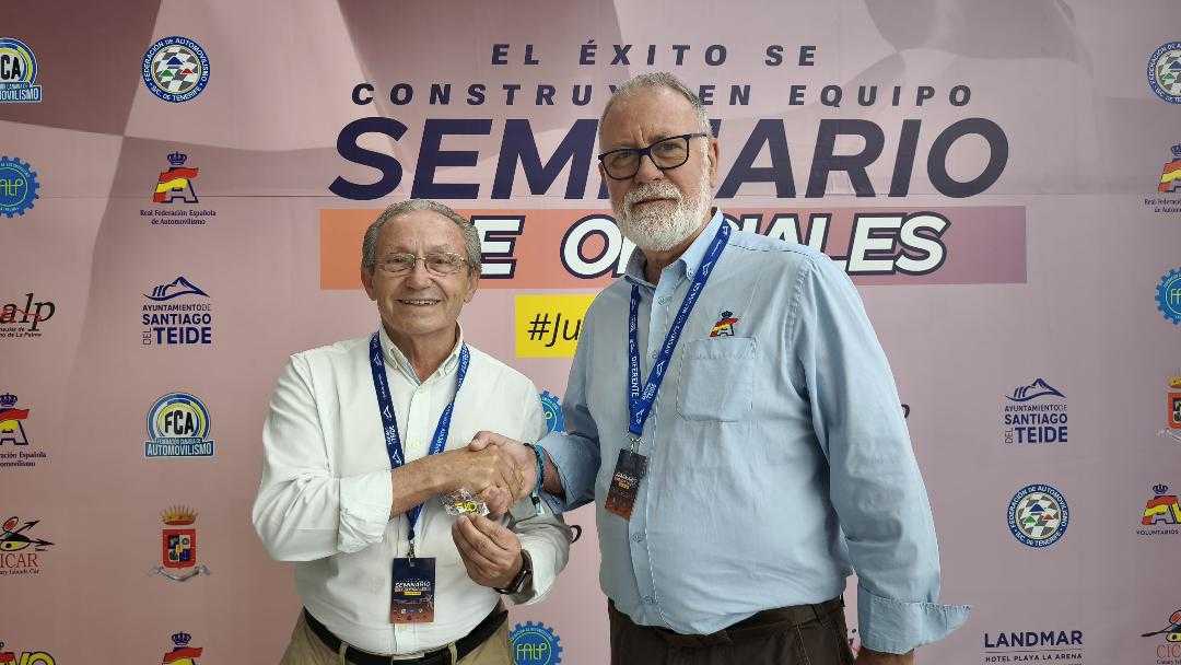 El presidente de la Comisión de Oficiales y Voluntarios de la RFEDA, Jerónimo Cuerva, reconocía la labor de la Federación Canaria de Automovilismo con la entrega de una insignia a su presidente Miguel Ángel Domínguez. Un distintivo que pone en valor el compromiso en la mejora de la formación de los oficiales, destacando su contribución al desarrollo de un automovilismo más profesional y cualificado.