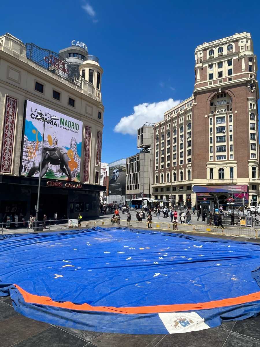El montaje arrancó con la instalación de la plataforma y del anillo perimetral que delimitará el círculo de brega. La estructura, adaptada especialmente al entorno urbano, permitirá recrear las condiciones propias de un terrero tradicional en un enclave tan emblemático como el corazón de la capital española.