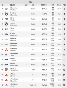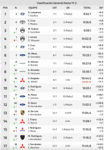 De esta manera la general queda con Alexey al frente de la general con un tiempo de 9:52.7, superando en 3.9 a Enrique y en 6.4 a Miguel, que supera ten la general al lanzaroteño Yeray Lemes y David Vázquez (Citroën C3 Rally2), cuarto en el tramo a 6.8 y ahora cuarto de la general a 10.1