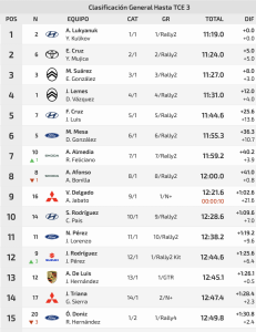 Estas tres victorias de tramo en la cita del Campeonato de Canarias, Santa Cruz de Tenerife e Insular de La Palma de Rallys propicia que el equipo oficial de Hyundai Canarias acabe la primera jornada con una renta de cinco segundos sobre los líderes del certamen Regional, el tinerfeño Enrique Cruz y el grancanario Yeray Mujica (Toyota GR Yaris Rally2), segundos de la general después de dos segundos y un tercer tiempo de especial.