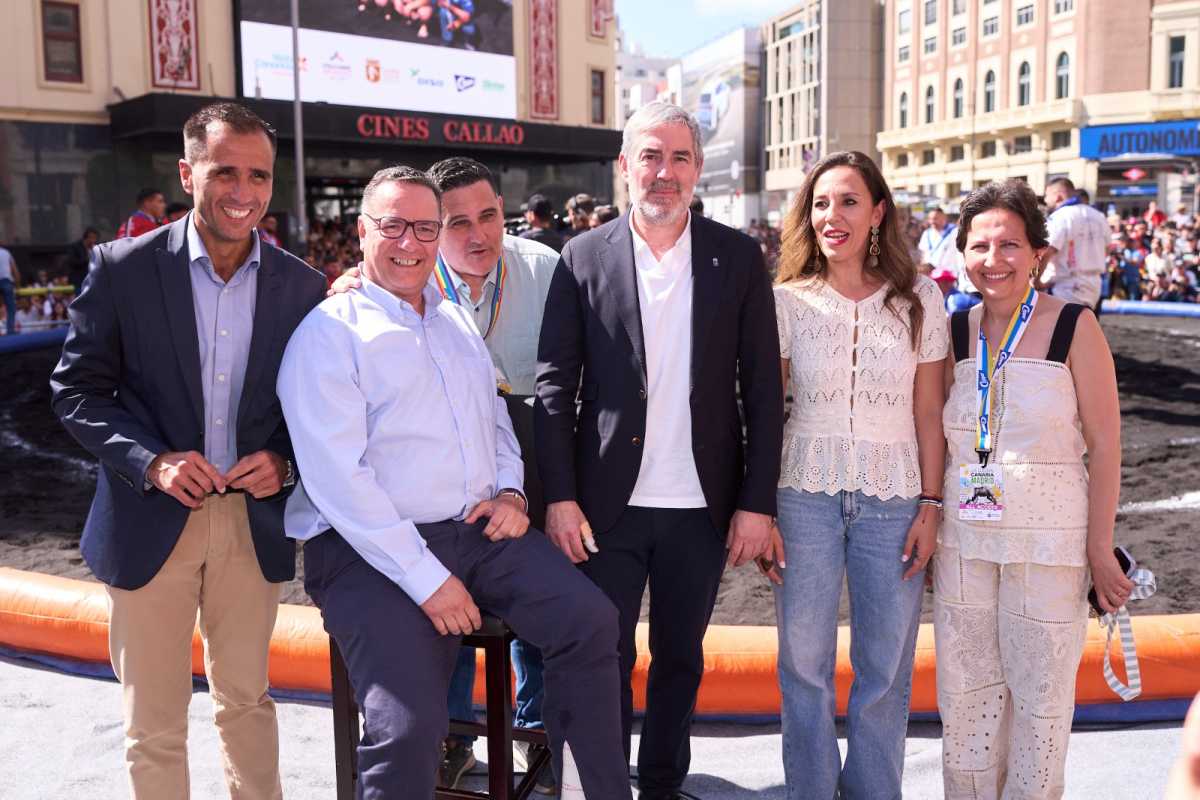 Para hacer posible esta cita sin precedentes, enmarcada en los actos programados por el Mes de Canarias, se instaló en este emblemático espacio de la capital un terrero con un graderío portátil con capacidad para cerca de doscientos espectadores. Además, la superficie de competición se cubrió con veinticuatro toneladas de arena volcánica procedente de la isla de La Palma, la más joven de las islas tras la erupción del Tajogaite, elegida como símbolo de identidad, arraigo y renovación.