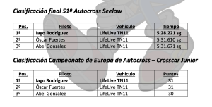 El joven piloto gallego Iago Rodríguez, vigente campeón de España de Carcross Junior, debutó este fin de semana en el Campeonato de Europa de Autocross con un triunfo espectacular en la primera cita del certamen, disputada en el circuito alemán de Seelow. A bordo de un Life Live TN11, la joven promesa chantadina demostró que va a ser uno de los candidatos al título europeo después de un intenso primer fin de semana de competición a nivel continental.