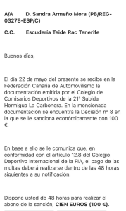 La piloto tinerfeña Sandra Armeño se queja de una sanción en la pasada Subida Hermigua – La Carbonera que, a su juicio, no se ajusta a la realidad, por lo que se está planteando muy seriamente dejar de competir.